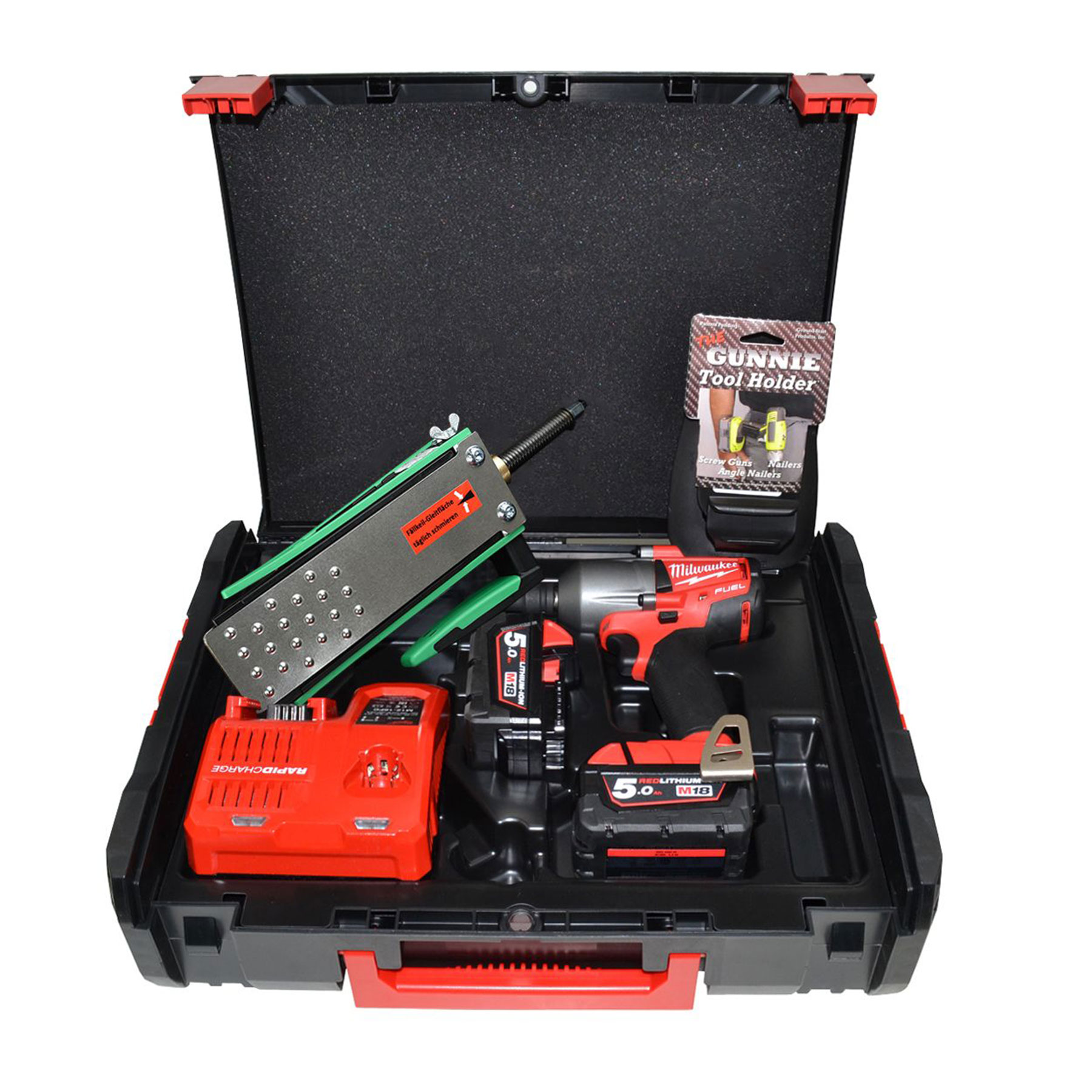 Der Milwaukee FMTWF12 mit einem Gewicht von nur 2,4kg (mit Akku) ist für den Einsatz mit dem ValFix hervorragend geeignet und lässt sich noch bequem mit dem mitgelieferten Gürtelhaltern am Körper tragen.