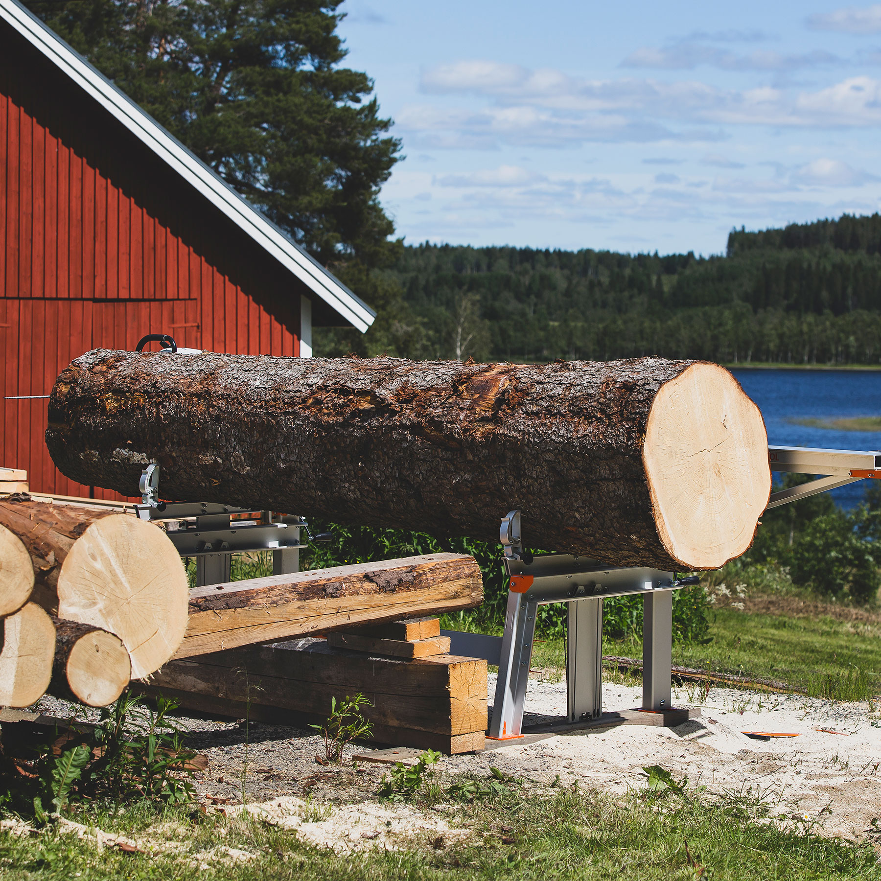 Das neue Bandsägewerk 751 von Logosol wird in Schweden hergestellt. In der Grundausführung können 4,8 Meter gesägt und Stämme mit