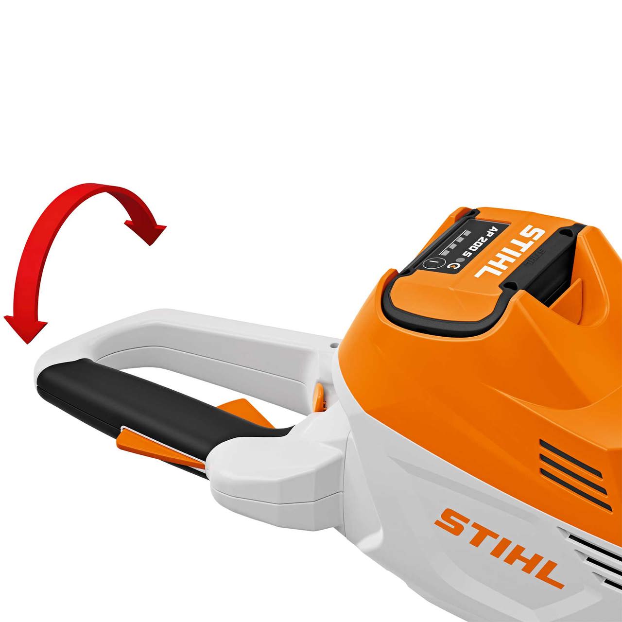 Per Knopfdruck können Sie den verbesserten Multifunktionsgriff um jeweils 90° nach links und rechts drehen und mit Ihrer STIHL HSA 100 besonders ergonomisch in verschiedene Richtungen schneiden, beispielsweise beim Seiten- oder Kopfschnitt. So können Sie Ihre Heckenschere sowohl mit der rechten als auch mit der linken Hand einfach führen. Der Bügelgriff unterstützt zusätzlich ein kräfteschonendes Arbeiten mit der Heckenschere. Das STIHL Antivibrationssystem mindert auftretende Motorschwingungen und schont so in längeren Arbeitseinsätzen Ihre Muskeln und Gelenke.